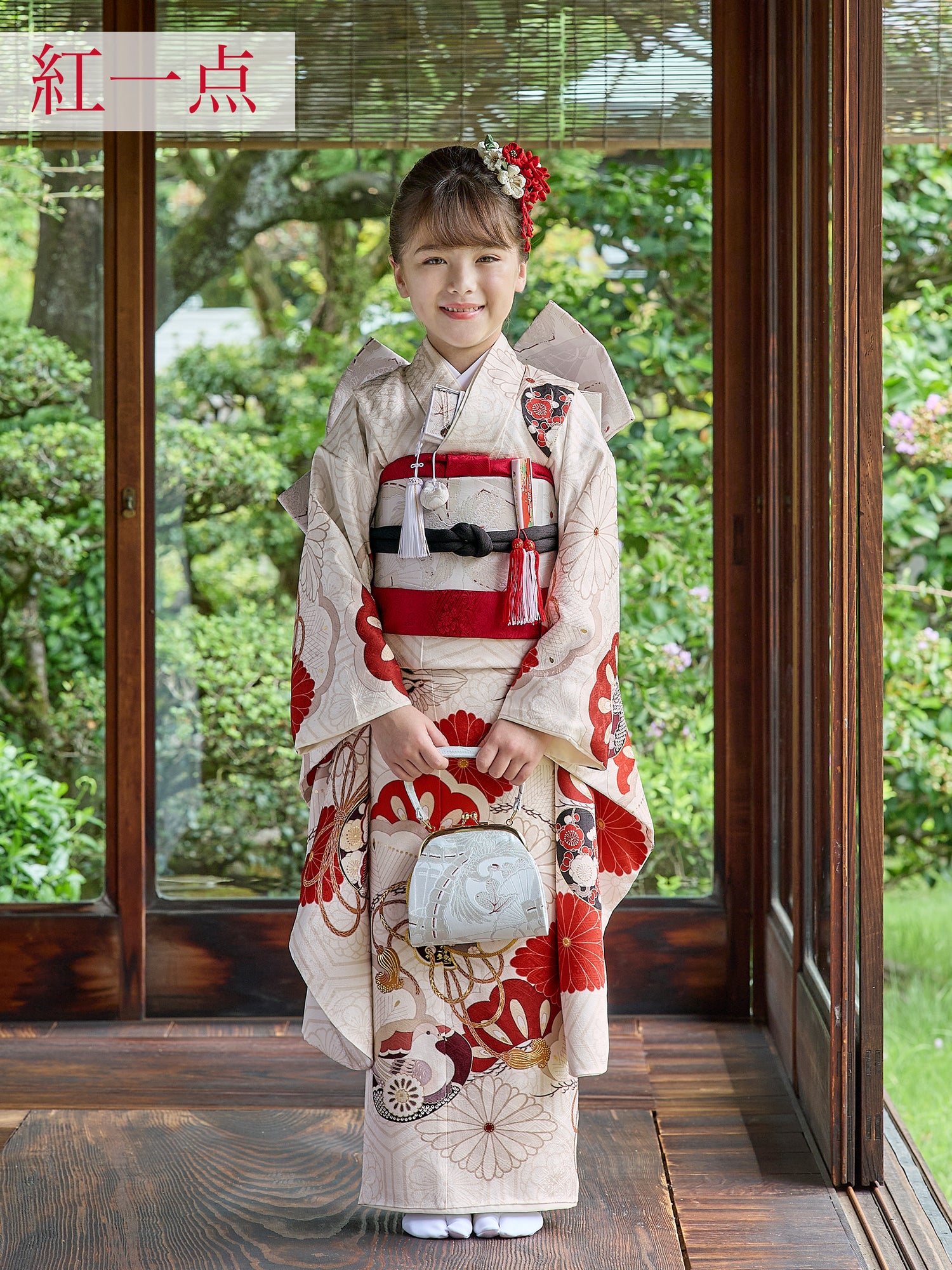 七五三 着物 レンタル 7歳 女の子【紅一点】小槌に菱菊(白) S0732